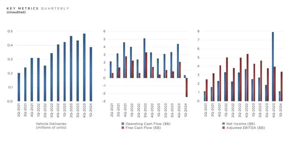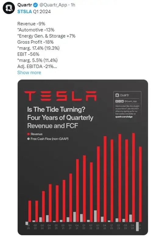 4 月 23 日周二美股盘后,全球市值最大的汽车制造商特斯拉 (TSLA.US)发布 2024 年一季度财报。
