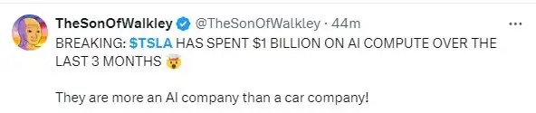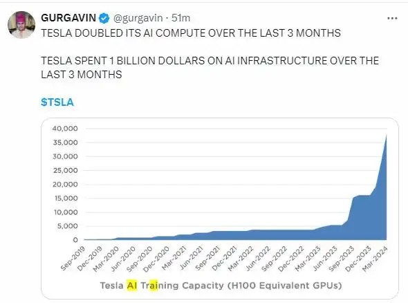 此外,有分析称,特斯拉在今年头三个月在 AI 计算中投入了 10 亿美元,令其更像是 AI 公司而不是车企。